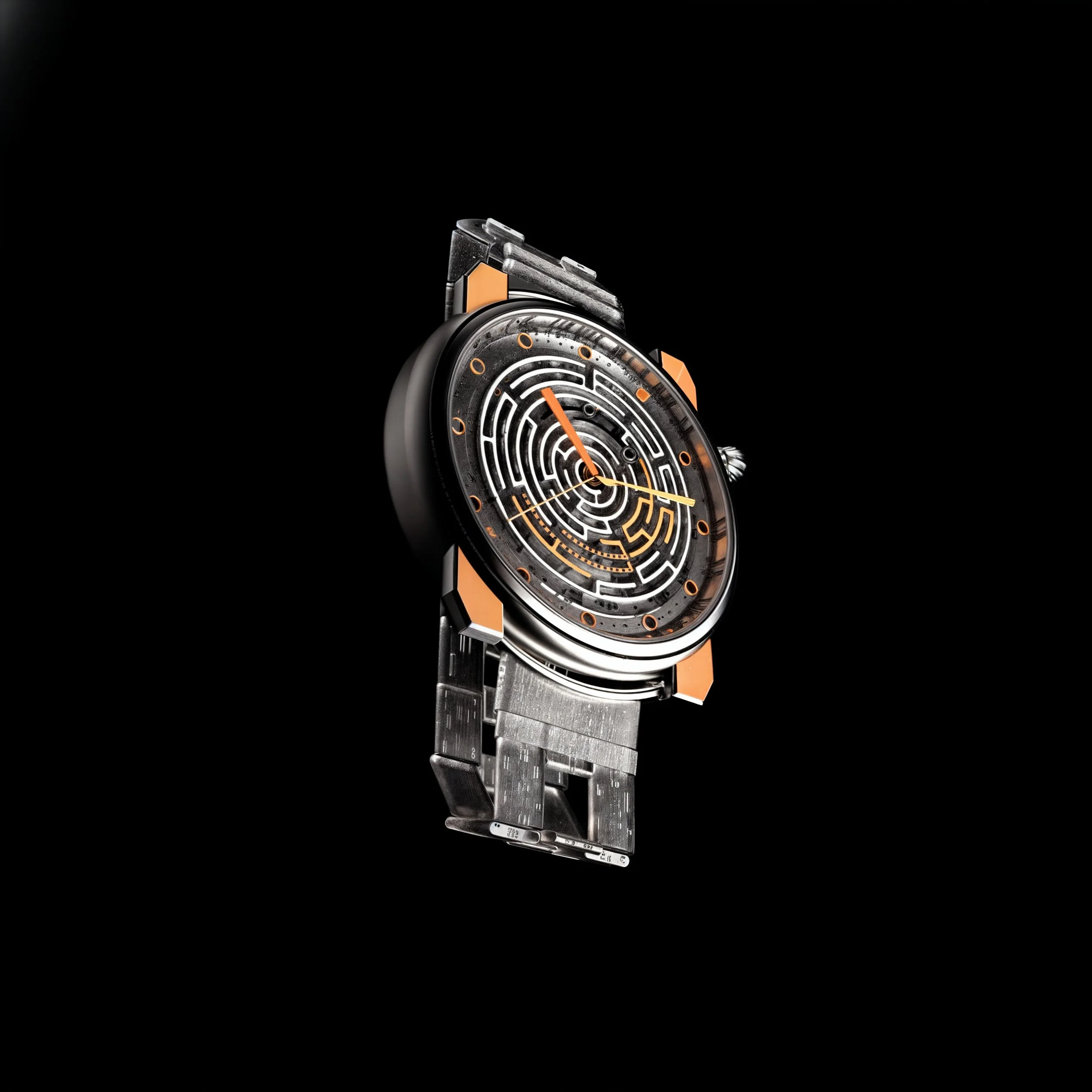 "Chakra." it's a bold statement that celebrates the fusion of nostalgia and tech modernity. By integrating a transparent digital screen, it becomes a symbol of creativity and forward-thinking design. It's form is inspired from the vintage arcade games and other tangible games like the labyrinth (the ball maze game). It's straps are crafted from silicone with intricate engravings adhering to its elegance.